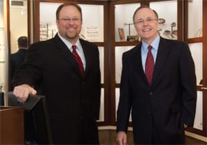 Sleek acrylic frame bars and glass shelves make the newly redesigned space feel more open. Above: Terry Foster, OD, and Randal Cox, OD