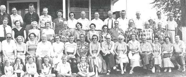 Top: Attendees of the Association of Independent Optical Wholesalers Clambake, June 26, 1952, in Rehoboth, Mass.; Middle: A. Reed McIntire, AAWO's first president; bottom: the first elected board of directors of OLA