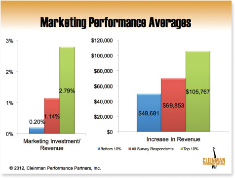 In 2011, in an effort to more clearly understand the impact of marketing on client practices, Cleinman Performance Network conducted a survey of members to ascertain their marketing investment levels and the results of their efforts. We defined marketing as “all consumer touchpoints that bring awareness to a practice and its products, including but not limited to public relations, advertising, promotions, donations, etc.”