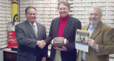 (L to r) Signet Armorlite’s Joe Farina with Roger K. Johnson, OD, winner of the “Picture This You at the Big Game” contest, and Gary Burkett of Westmoreland Optical