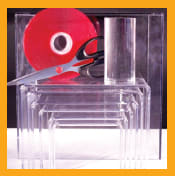 SUPPLIES: Set of clear risers bought online, clear double-sided high adhesive tape, fabric shears, and an acrylic 10x10 vitrine |