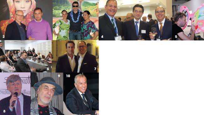 1. Crowds gathered at the brand new Marchon booth, unveiled for the first time at Mido; 2. The Area 98 team showed off frames featuring silk, feathers, and dried leaves; 3. World canoeing champ Antonio Rossi and friends at Maui Jim's booth; 4. Helping Nidek CEO Motoki Ozawa (c) celebrate its 40th anniversary in the U.S. with distributor Santinelli International are Santinelli's Rick Clemente and Gerard Santinelli; 5. Visionaria brought a collaboration of artists to create live and in person in front of the exhibit area; 6. Jamie Shyer, chairman of The Vision Council, spoke at the joint meeting of the European Sunglass Association (ESA), The Vision Council, and EUROM; 7. Marchon's Robert Shienberg and Mark Ginsberg greeted guests in the courtyard of Palazzo Clerici at a celebration of Marchon's “Wild Eyes” fashion/photo feature in Vogue Italia; 8. Silhouette's Arnold Schmied discussed the company's plans for 2012 and beyond at an evening press event; 9. Ron Arad, designer of the new pq eyewear, talked about design, architecture, and eyeglasses; 10. Cirillo Marcolin, president of Mido and ANFAO, addressed guests at a preopening press conference