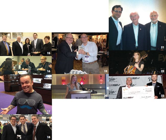 15. Reed's Tom Loughran (l) and Val Scott (r) presented HOYA's Barney Dougher, Heather Padgett, and Grant Zider with the Best New Product award; 16. Merchandising Magic panelists Travis Reed (r), Eric Feigenbaum (c), and Kenmark's David Duralde (l) answered questions at the Frame Buyer Certificate Program course; 17. Wee Man signed autographs at the VonZipper booth; 18. Marc Ecko, with ClearVision's executive vice president Peter Friedfeld (l) and president David Friedfeld (r), came to promote his latest eyewear collection; 19. A&A's Robert Liener presented the $1,000 cash prize to drawing winner Rob Lewis, Wisconsin Vision, New Berlin, Wisc.; 20. The Vision Council sponsored the Stylesight Trend Report prior to the show's opening; 21. Industry veteran Ken Woods (c) congratulated on his retirement by The Vision Council's Greg Chavez and Ed Greene; 22. Lisa Loeb, who has an eyewear collection with Classique Eyewear, performed at the Eye Rock concert; 23. Viva president Frank Rescigna presented a $50,000 check to Justin Timberlake on behalf of William Rast Eyewear for Shriners Hospitals for Children