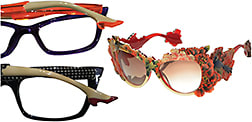 Face a Face takes shapely temples to the stylish extreme: distinctive tips with a kick (l), and Okia’s photorealistic finishes