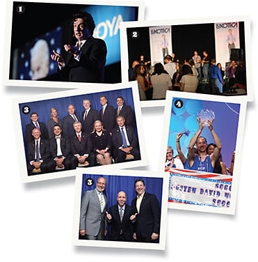 1. Comedian Martin Short entertains at the HOYA-sponsored Celebration of Optometry; 2. Students enjoy Eye Docs of Rock at Luxottica Live; 3. AOA’s new Board of Trustees (including new president David Cockrell, O.D., front row center) gather at Optometry’s Meeting; 4. SCCO’s David Nguyen celebrates his win at the Varilux Optometry Student Bowl; 5. Keynote speaker Scott Hamilton “hams” it up with (l) Essilor’s Rod Tahran, O.D. ,and (r) Howard Purcell, O.D.