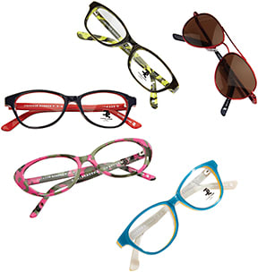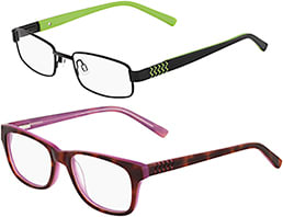 For girls, modified ovals provide an easy, lightweight fit and a metal/plastic combination available in tortoise/bronze, purple/deep purple, and pink/hot pink. Balancing two rivets placed onto plastic frame fronts, three diagonal lines interrupt sleek plastic temples.