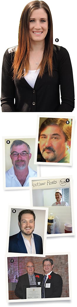1. Jennifer Kammes, Super Systems Optical; 2. Brad Main, Rochester Optical; 3. John Haigh, Schneider Optical Machines; 4, A root beer float sale plays a role in Vision-Ease’s Food Share drive.; 5. Nic Kane, Schneider Optical Machines; 6. NSL Analytical Services’ Larry Somrack (l) and Doug Adams of the CTSC.