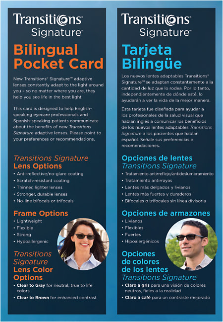 Transitions Optical, Inc., has introduced a bilingual pocket card to help alleviate language barriers when dispensing eyewear or discussing the latest lens technology to patients. Small enough to fold in half and tuck into a pocket, the card allows English-speaking ECPs to easily explain the benefits and features of the new Transitions Signature adaptive lens technologies to their Spanish-speaking patients. Patients can simply point out their preferences for everything from the color of their lenses to additional features, such as anti-reflective coatings or frame considerations. ECPs can request printed copies free of charge through the “My Practice” section of MyMulticulturalToolkit.com.