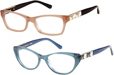 Viva Group’s GUESS handmade acetate frames in fun and flirty shapes, including the cat-eye shape of model GU2415 (shown below right), are offered in crystallized colorations of beige and light blue, as well as solid black and tortoise. Fashion-forward elements, such as clear rhinestone and metal pyramid accents, decorate the handmade acetate temples of several of the season’s new models, while the satin metal hardware and stone adornments add to the luster of these playful styles for today’s GUESS girl.