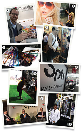 1. Christoph Metzelder by Emmerich; 2. Claudia Schiffer visits Rodenstock; 3. A custom frame design kit offered by Claire Goldsmith; 4. A clever display inspires double-takes on the show floor; 5. Guests take a shot at the Oakley booth; 6. opti Walk of Frame 7. Thomas Truckenbrod of Central Association Opticians and Optometrists (ZVA), Josef May of the German industry association SPECTARIS, and Dieter Dohr of the Management Board of GHM Gesellschaft für Handwerksmessen mbH open the trade show press conference; 8. Hugo-Boss model Werner Schreyer with his capsule collection by Gloryfy
