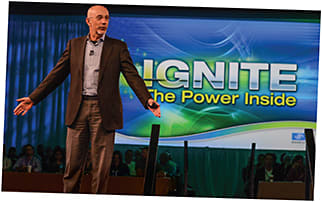Essilor of America president and CEO John Carrier addresses attendees against the backdrop of the meeting’s theme: IGNITE The Power Inside