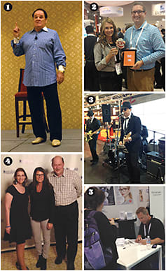 1. Baseball legend Pete Rose speaks to the Optical Lab Division about the importance of teamwork, and shares entertaining stories from the diamond; 2. Jennifer Douglas and David Carr from VSP Optics Group enjoy the “Appy Hour” the company hosted at its booth; 3. This blues band keeps the Ray-Ban booth rocking; 4. Soccer star and Coppertone Lenses ambassador Mia Hamm welcomes Vision-Ease Lens customers at a special meet-and-greet event; 5. Author Scott Deming signs copies of his book, “The Power of Purpose—How to Create a Values- and Purpose-Driven Organization,” at the Eyecare Business booth after leading a spotlight session that morning