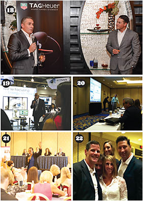 18. Logo of the Americas’ Miguel Lopez (l) and Essilor’s Pierre Bertrand celebrate the launch of TAG Heuer with Xperio lenses with a food and wine pairing party at Aquaknox Global Water Cuisine; 19. Dr. Larry Alexander presents Optovue’s iScan OCT unit with a live demonstration; 20. Opti-Port’s day-long educational event begins with keynote speaker Randy Street, managing partner of ghSMART and author of “Who: The A Method for Hiring”; 21. Valerie Manso of VSP Vision Care moderates a panel on the dynamics of men and women working together, sponsored by the Optical Women’s Association (OWA); 22. The OWA’s networking event and raffle provides members and supporters a way to relax after a long day. Shown: (l to r) Satisloh’s Kevin Paddy, consultant Heather Campbell, and Brian Peterson of Satisloh; back row, Steele Young of Satisloh, Morgan Piatt, Live Eyewear