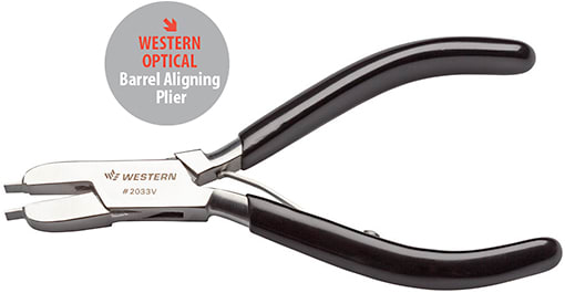 The new Barrel Aligning Plier from Western Optical Supply is the perfect tool for this adjustment. In moments you can reset the proper alignment and spacing to reassemble the frame so the temple is a good tight fit.