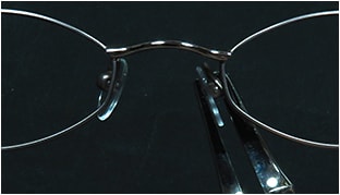 STEP ONE: The first step is to narrow the space between the nose pads. This can usually be done with pad-adjusting pliers that hold the face of the pad and the box at the end of the pad arm. To start, be sure that you grip the eyewire on the same side of the nose pad you are narrowing, keeping your wrist locked while using upper body strength to simply move the pads straight toward the center. Do this evenly on both sides. One small bend in the wrist and you will accidentally change the frontal angle in a manner that will be counterproductive.