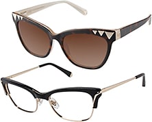 The rich color palette includes amber, tortoise and blush, crystal, khaki, black, and gray. The collection consists of six ophthalmic styles and eight sunglass models with metal details in a variety of finishes.