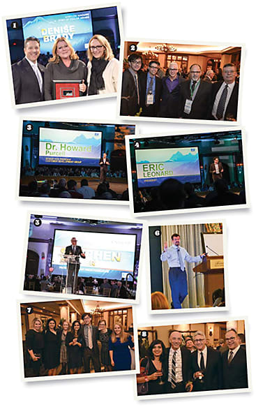 1. Denise Brady, center, receives first ever MaryLou McGuire Spirit of Essilor Award. With her are (l) Howard Purcell and Ellen Haag; 2. (l-r) Dukgun Kim, Jeff Angerbauer, Carl Bracy, Gabriel Keita, and Bill Markham at the awards banquet; 3. Howard Purcell, O.D., presents at EOA Opening Session; 4. Eric Leonard presents at EOA Closing Session; 5. Stephen Shawler speaks during EOA Award Banquet about the Essilor Vision Foundation; 6. Pete Hanlin, LDO, director of technical marketing, presents during Product University; 7. At the awards dinner (l-r) Sherri Rajan, Meghana Dhall, Morgan Maxwell, Avanti Upponi, Dukgun Kim, Tamara Sanders, Kameron Brewer; 8. Enjoying the awards dinner: (l-r) Bidisha Rudra, John Carrier, Bob Colucci, Rick Gadd