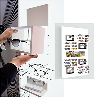Other items that can easily be added to the magnetic setup are shelving, accent boxes, and mirrors—all available from One Interior—or specific logo merchandising from frame vendors.