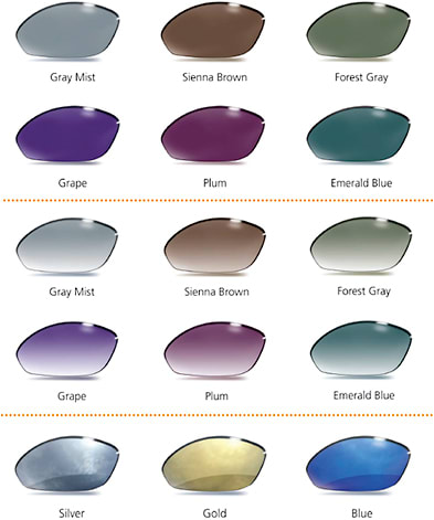 DESCRIPTION: Essilor Sunwear Colors, a new range of colors and gradients available in standard tints and polarized lenses, are available as an Xperio UV polarized sun lens, Crizal Sunshield no-glare coating on tinted lenses, Xperio UV Mirrors, or Crizal Sunshield Mirrors in gold, silver, and blue for consumers to create their own custom color combination. Essilor Sunwear Colors lenses are available in a wide range of single vision and full backside designs.