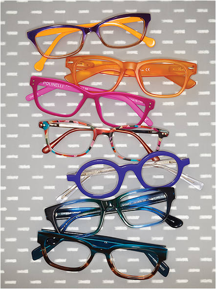 Hue for You: (top to bottom) eyeOs model Laila is on trend with a gradient effect on the frame front shifting from purple to orange. Vibrant orange reader from Hilco’s Shoptic display comes with a matching colored pouch. Model P200 from FGX International’s new Polinelli collection offers patented blue-light-blocking technology. Peepers by PeeperSpecs goes geometric with its new Line Leader style. Model Flat Tire from eyebobs is fresh and funky with a purple front and clear temples. Corinne McCormack model Sydney from FGX International has a natural color mix. Scojo New York model Harper St. from Ogi Eyewear rounds out the mix in Seaside color.