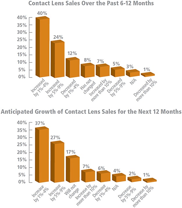Additionally, 75% of survey respondents have seen an upward trend in overall sales of contacts in the past year, with 64% seeing between 1% and 9% in growth.