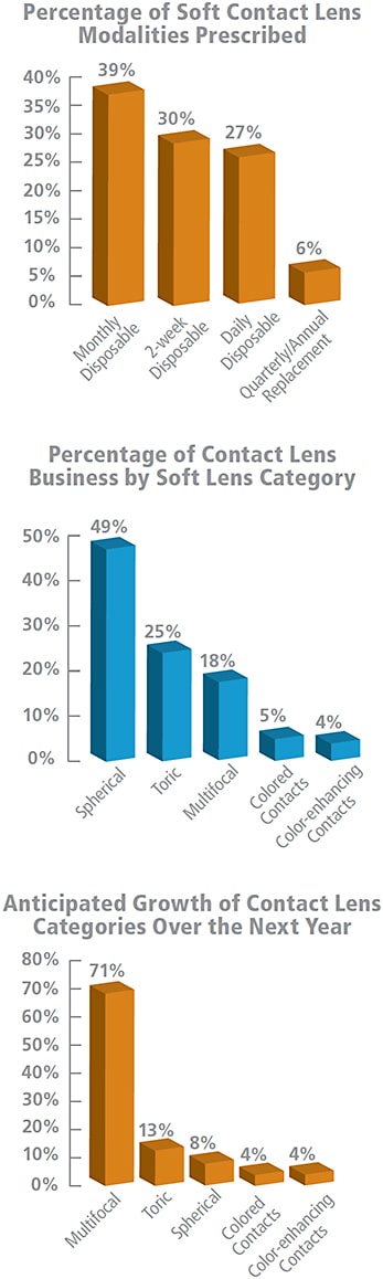 Monthlies are the popular replacement modality among soft contact lens wearers, and the majority of ECPs believe that multifocal sales will increase over the next year. See below for other hot and growing contact lens categories.