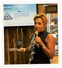 Holly Rush, CEO of Costa, gives a presentation on the future of the brand as it launches its new ophthalmic collection