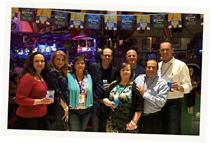 ZEISS celebrates the 200th birthday of Carl Zeiss with a customer appreciation dinner and a trip to see the Blue Man Group. Some of the ZEISS crew gathering at the dinner are (l-r) Veneeta Eason, Summer Bouchedid, Karen Roberts, Claude Labeeuw, Bernadette Hiskey, Michael Racioppi, Jon Goldberg, and Jens Boy