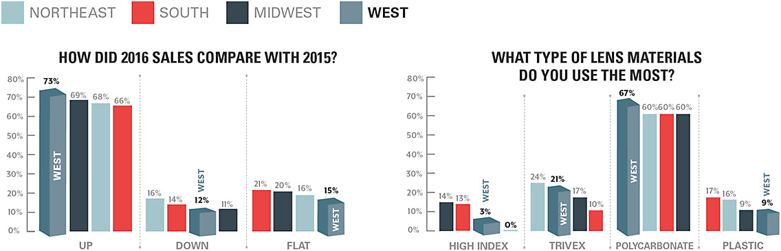 Another could be the Northeast’s emphasis on lenses. ECPs here sell more PAL, digital/blue light, and Trivex lenses, as well as more plano sunwear, than ECPs in other areas.