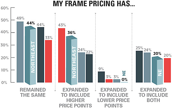 For example, 60% of Midwestern ECPs do not edge in-house, and they’re twice as likely as practitioners in other regions to add lower-priced product to their mix. They also sell a lot more combination (plastic + metal) frames, and locations tend to be smaller, with nearly a quarter of practices registering annual sales of under $200,000.