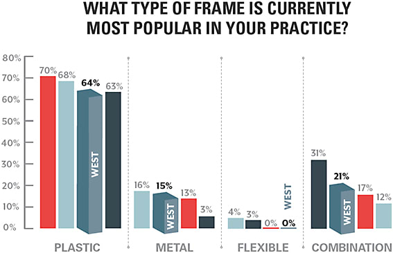 To what are those strong numbers attributed? Volume. A solid 34% of practices surveyed report a single-location sales volume of $1 million to $3 million. As a result, inventory numbers are higher than other regions, with 34% of Western locations boasting a mix of 750 to 1,000 frames and 25% carrying more than 1,000.