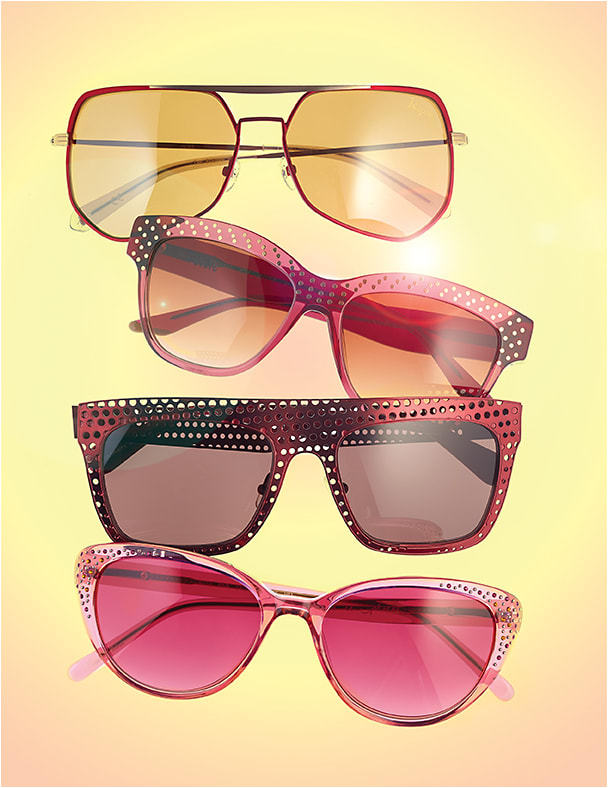 From top: Original Penguin “The Iceman Sun” from Kenmark Eyewear modified metal aviator in burgundy metal. Steve Madden DOTZ from ClearVision Optical deep modified square shape in plum acetate with laminated metallic foil. Diane von Furstenberg Grace DVF 124S from Marchon metal laser-cut shield sunglass in burgundy. Phoebe P718 from Nouveau Eyewear in rose acetate with inlaid multicolored crystals.