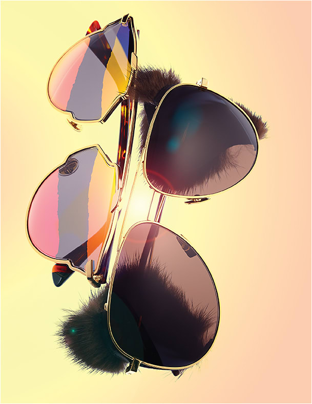 From left: Dior DiorSoReal from Safilo gold metal panto-shaped frame with ripped-effect, tricolored double-mirrored lenses made in the Safilo Lenti lens factory. Saint Laurent Classic 11 Shields from Kering Eyewear gold pilot with mink fur side shields.