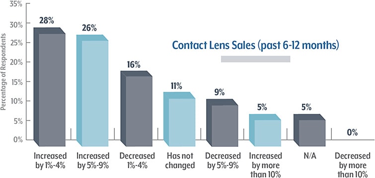 More than half (59%) of respondents have seen an upward trend in overall sales of contact lenses over the past year (down from 77% in 2015). Slightly fewer are optimistic when it comes to predicting how their contact lens sales will compare in the coming year, as only 57% believe there will be an increase.