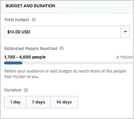 I like the concept of $1 a day because it’s a cup of coffee. Plus, I’m cheap, LOL. Here you see the potential audience size of 1,700+ people when boosted for 14 days at $1 a day. If I got just one new customer to schedule an appointment, it would more than cover the cost of 14 cups of coffee. Read: winning.