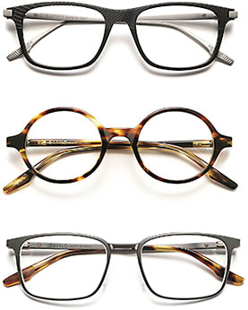 The collection includes metal and acetate materials in round, aviator, and cat-eye shapes.