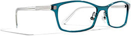 Pictured is style F-2024, a combination frame featuring a metal front sandwiched between two layers of acetate. The squared-off cat-eye silhouette is available in Black Feather, Brown Feather, and Teal Feather.