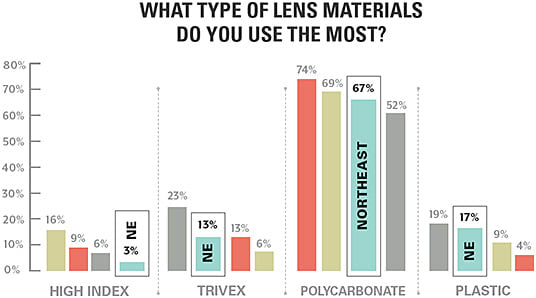 Eyecare professionals in the Northeast also sell more plastic and higher-end frames than their peers. And, in the lens arena, ECPs here have reported the biggest increase in in-house edging over the last five years.