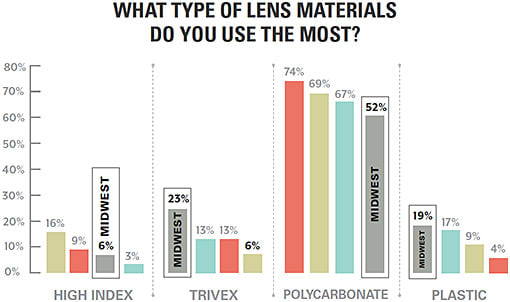 How is that reflected in optical? Nearly three-quarters (74%) of jobs are made in poly. That’s substantially more than other regions. Western ECPs also sell more AR (86% of jobs) than other areas.