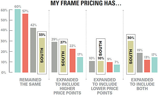 When it comes to the sexes, the South tops the charts in the sale of both women’s and men’s eyewear, while ranking lowest in unisex looks. And fully 30% of respondents say they’ve expanded to include both higher- and lower-end price points this year.