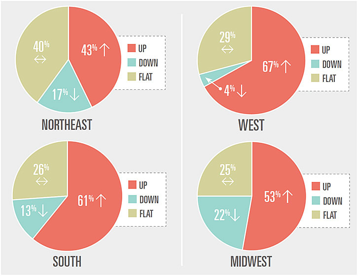 ↑ PRICES. Prices paid by urban customers in the West are up 3.5% from a year earlier, a bigger increase than any other region.