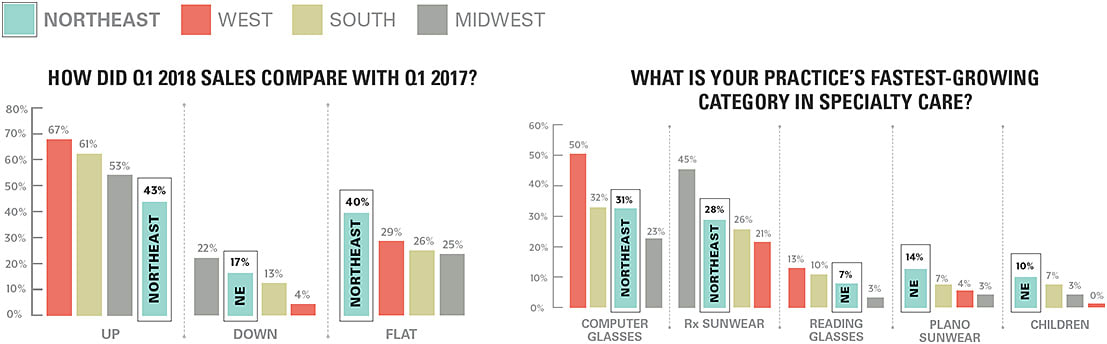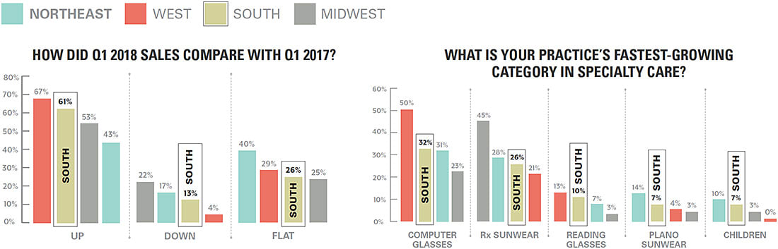 What about optical? Overall, ECPs saw sales increases in the first quarter compared with a year earlier. The Southern and Western states saw the biggest growth, while the Northeast had the least—less than half of ECP respondents reported increased sales for the quarter in the region.