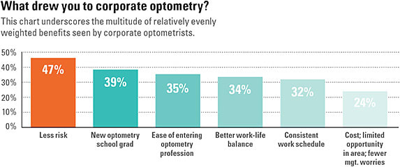 Nearly half (47%) of those surveyed say their main reason for choosing corporate optometry was that it is less risky than other modes of practice. Nearly 4 out of 10 also pointed out that corporate optometry is a great first step.