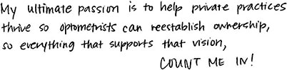 I’m excited because the current optometric environment is ripe for disruption. I’ve been working tirelessly to create an alternative to the way optometry has been drifting.