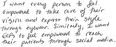 Believing that I have the power and a distinct voice to help positively change the perception of eye care and eyewear. It is an incredible honor to be able to inspire eyecare pro-fessionals to continue to pursue their wildest dreams in optical.