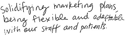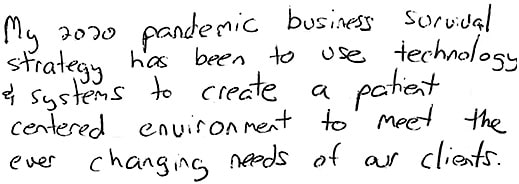 Adapting to change but thinking ahead by having the confidence to introduce new services, treatments, and products so patients continually have that wow factor. —S.S.