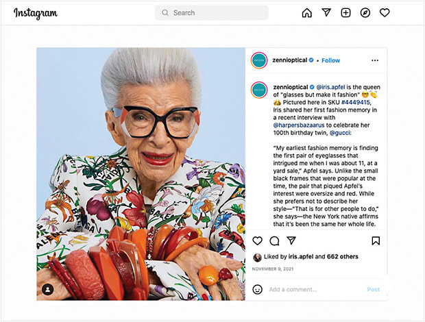 ➤ Influencers: Zenni partners with an array of social media stars such as style icon Iris Apfel (Zentennial Collection), actress Rashida Jones, and fashion designer Cynthia Rowley. Other partners include pro sports teams the San Francisco 49ers, the Chicago Bulls, and the Call of Duty League of video gamers.