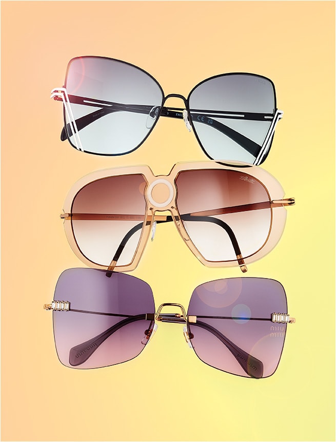 From top: The Emilio Pucci EP179 sunglass from Marcolin is a dreamy style crafted in metal and punctuated with standout white metal bar detailing. The Futura Dot 9912 sunglass from Silhouette is an ultralightweight and super-modern crystal-hued style with a centering circle detail. The Miu Miu MU50SW from Luxottica shines bright with elegant crystal detailing on a sleek rimless silhouette.