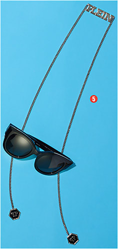 The eyewear chain is such an essential style element that designer Philipp Plein has embedded chain clasps into pieces in his summer 2022 sunwear collection, available from De Rigo REM. The charmed “Plein” sterling silver eyeglass chain embodies his brand’s signature rock glamor, and the chain link is purposely echoed in the chain inlay along the sunglass brow line of the unisex sunglass.
