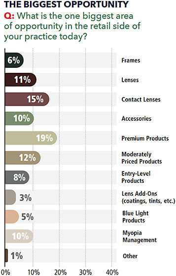 This optimism is reflected in optical sales. A full 58% report that their bottom line is up in 2023 over 2022, with 25% saying that it is up 10% to 20% year over year. Asked about their greatest opportunity at retail right now, ECPs pointed to premium product as a top option.
